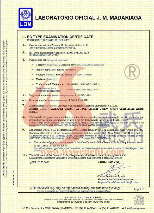 瀏陽市文馳電點火具有限公司(原培文電子點火器材廠),創建于1998年,是一家專業從事研制銷售電子點火產品的民營科技企業,是我國第1枚煙花用電點火頭生產者,是《煙花爆竹電點火頭國標》牽頭起草單位。公司位于中國“煙花之鄉”湖南省瀏陽市,地理位置優越,交通便利?! ? 我公司研制的對象是用電能引燃火藥、做機械功等預定功能的一次性使用的元件或裝置,包括電點火頭(英文名ElectricMatch or Electric Igniter,中文俗稱“電火柴”或“電發火頭”)、電點火管和延期電點火管;我們估且在以后的產品技術欄中將我們研究的產品統稱為電點火具,將電點火器看成是用于提供和控制供給電點火元件點火的電能器材;我們研究的電點火橋路有橋絲式、無橋絲···